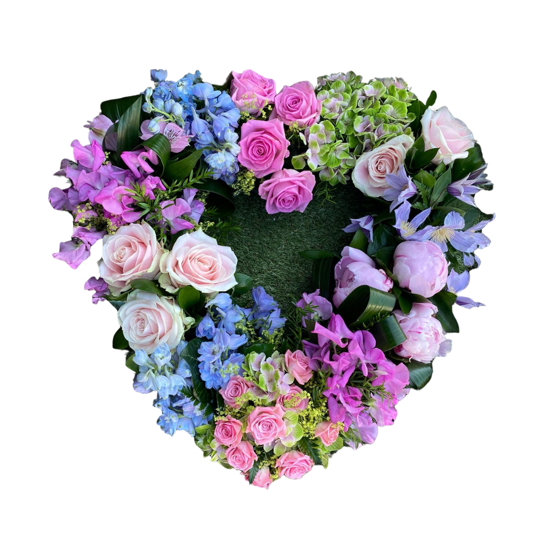 An open heart design including roses and other seasonal flowers.